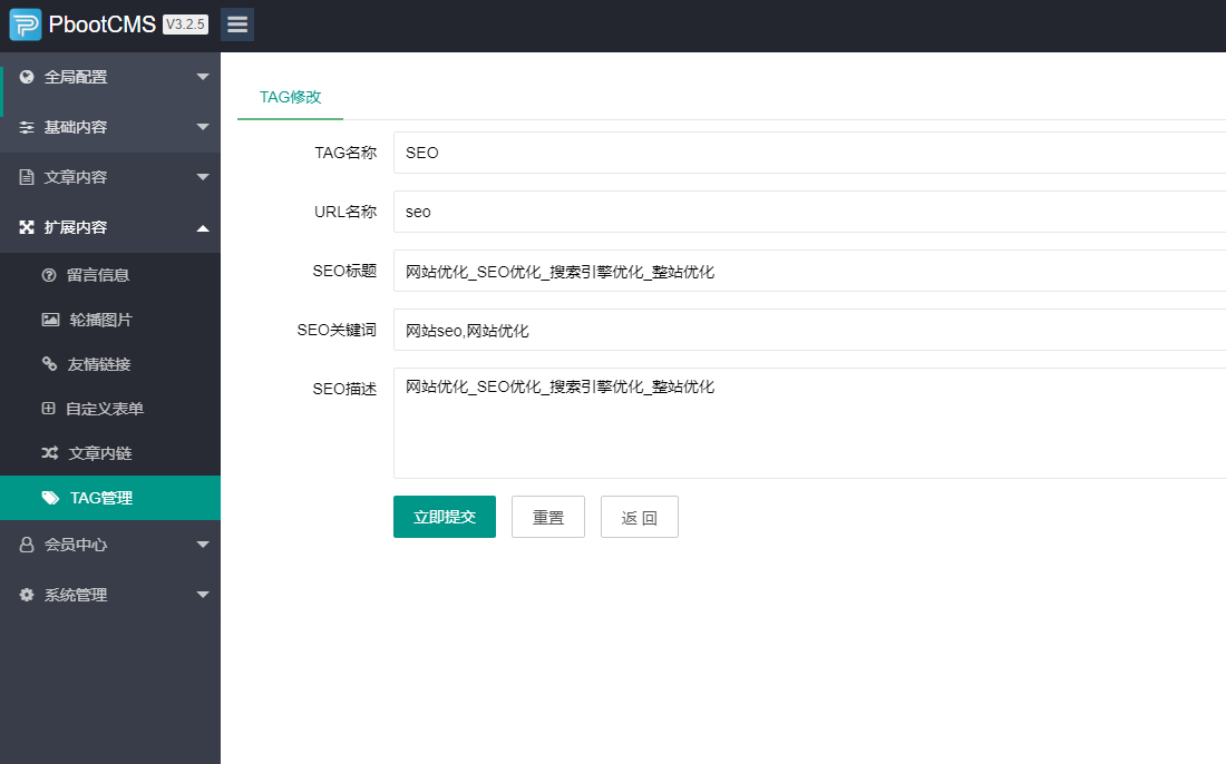 pbootcms程序TAG標(biāo)簽管理插件支持自定義URL和SEO