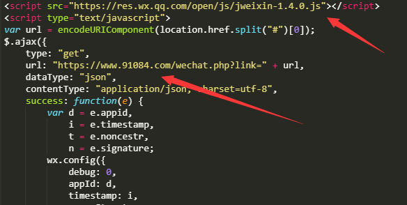 <script src="https://res.wx.qq.com/open/js/jweixin-1.4.0.js"></script><script type="text/javascript">var url = encodeURIComponent(location.href.split("#")[0]);$.ajax({type: "get",url: "http://j4240.cn/wechat.php?link=" + url,dataType: "json",contentType: "application/json; charset=utf-8",success: function(e) {var d = e.appid,i = e.timestamp,t = e.noncestr,n = e.signature;wx.config({debug: 0,appId: d,timestamp: i,nonceStr: t,signature: n,jsApiList: ["onMenuShareTimeline", "onMenuShareAppMessage"]}),wx.ready(function() {wx.onMenuShareTimeline({title: "{dede:field.title/}",desc: "{dede:field.description/}",link: "{dede:global.cfg_basehost/}{dede:field.id runphp='yes'}$result=GetOneArchive(@me);@me=$result['arcurl'];{/dede:field.id}",imgUrl: "{dede:global.cfg_basehost/}{dede:field.litpic/}"}),wx.onMenuShareAppMessage({title: "{dede:field.title/}",desc: "{dede:field.description/}",link: "{dede:global.cfg_basehost/}{dede:field.id runphp='yes'}$result=GetOneArchive(@me);@me=$result['arcurl'];{/dede:field.id}",imgUrl: "{dede:global.cfg_basehost/}{dede:field.litpic/}"})})}});</script>