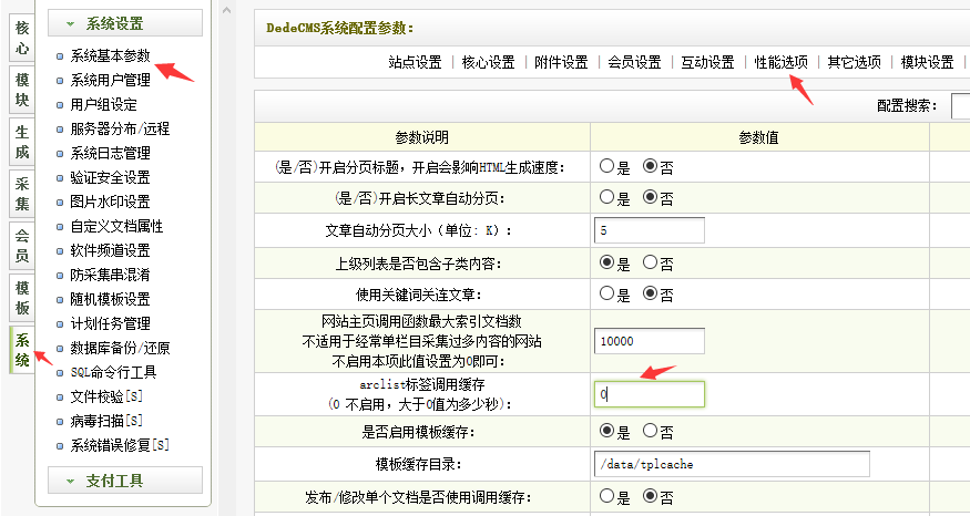 后臺(tái)-系統(tǒng)-性能選項(xiàng)-arclist標(biāo)簽調(diào)用緩存-0