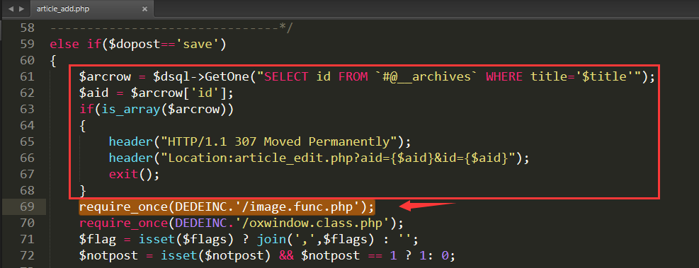 $arcrow = $dsql->GetOne("SELECT * FROM `dede_archives` WHERE title='$title'");$aid = $arcrow['id'];if(is_array($arcrow)){header("HTTP/1.1 307 Moved Permanently");header("Location:article_edit.php?aid={$aid}&id={$aid}");exit();}