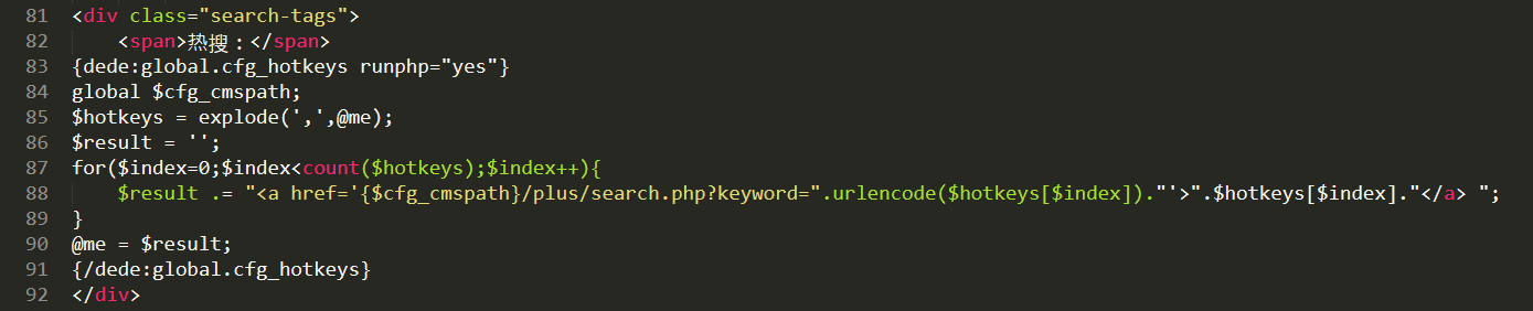 {dede:global.cfg_hotkeys runphp="yes"}global $cfg_cmspath;$hotkeys = explode(',',@me);$result = '';for($index=0;$index<count($hotkeys);$index++){$result .= "<a href='{$cfg_cmspath}/plus/search.php?keyword=".urlencode($hotkeys[$index])."'>".$hotkeys[$index]."</a> ";}@me = $result;{/dede:global.cfg_hotkeys}