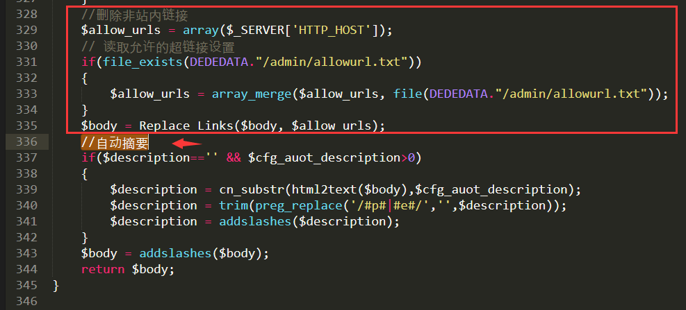 //刪除非站內(nèi)鏈接$allow_urls = array($_SERVER['HTTP_HOST']);// 讀取允許的超鏈接設(shè)置if(file_exists(DEDEDATA."/admin/allowurl.txt")){$allow_urls = array_merge($allow_urls, file(DEDEDATA."/admin/allowurl.txt"));}$body = Replace_Links($body, $allow_urls);