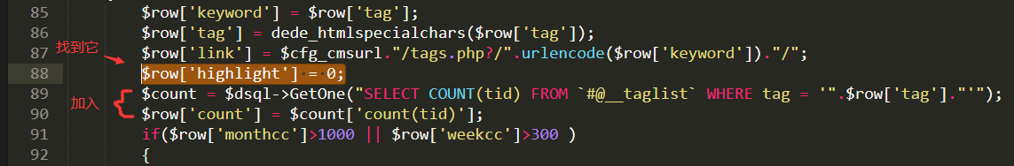 $count = $dsql->GetOne("SELECT COUNT(tid) FROM `dede_taglist` WHERE tag = '".$row['tag']."'");$row['count'] = $count['count(tid)'];