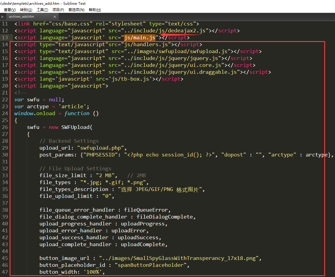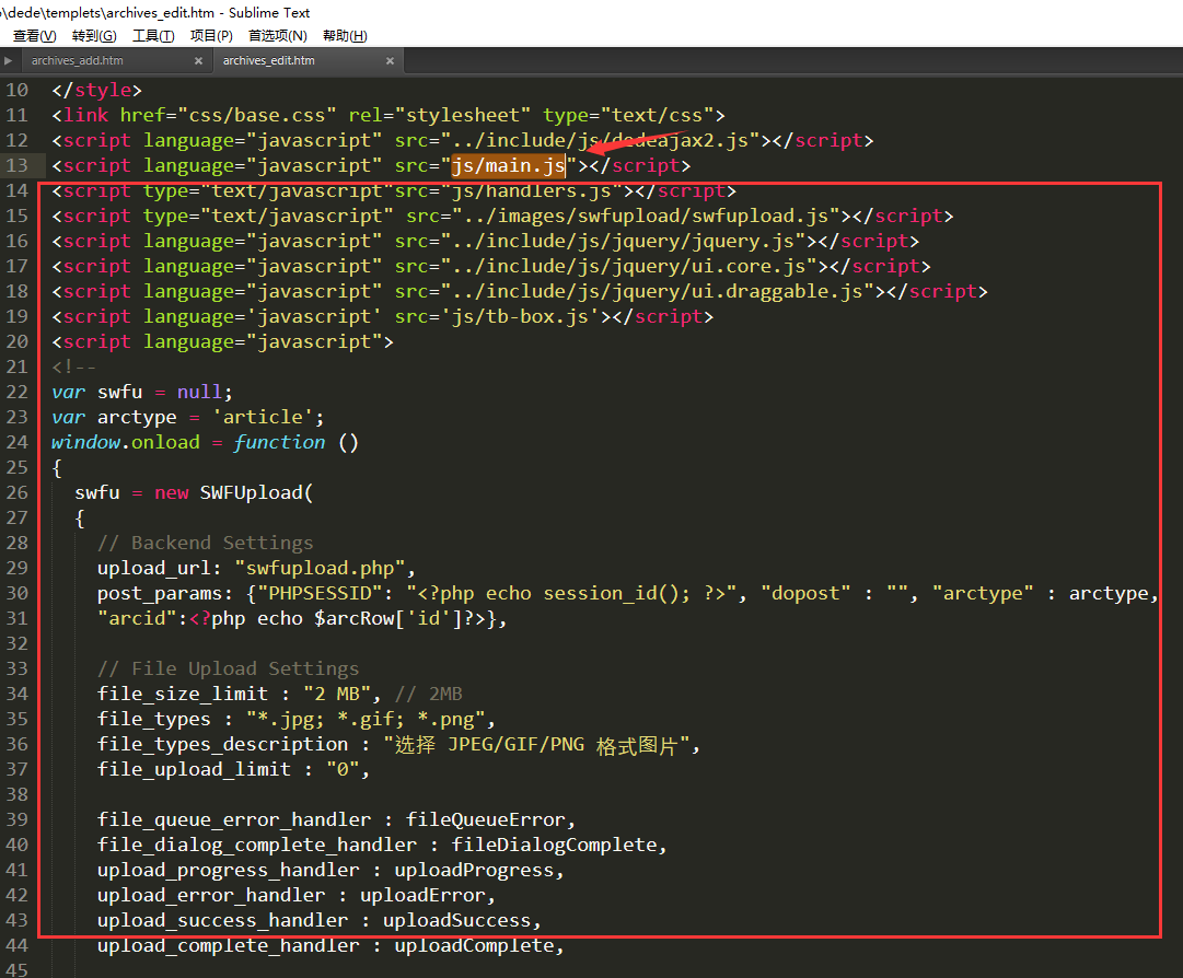 2、打開 /dede/templets/archives_edit.htm 找到