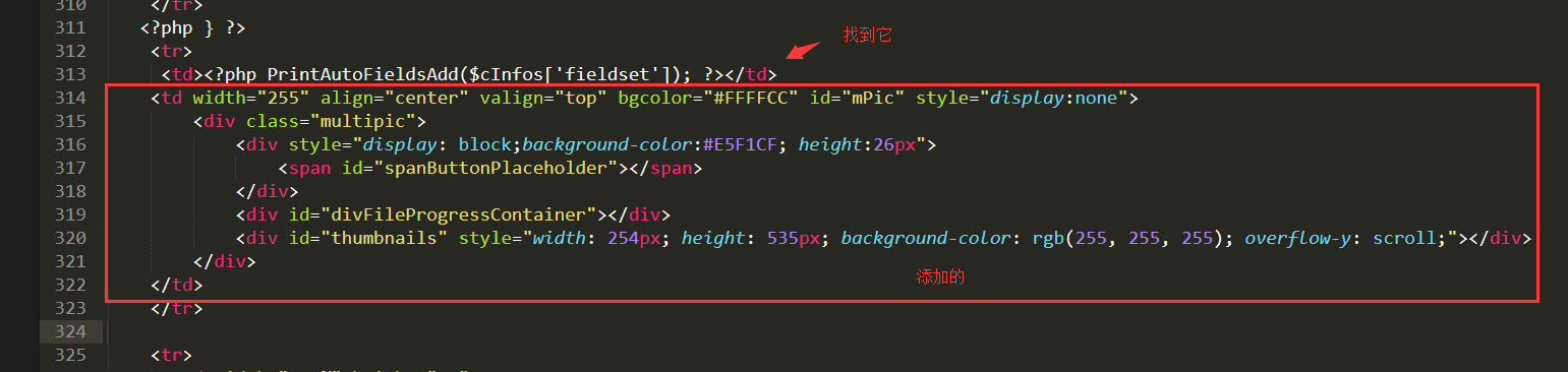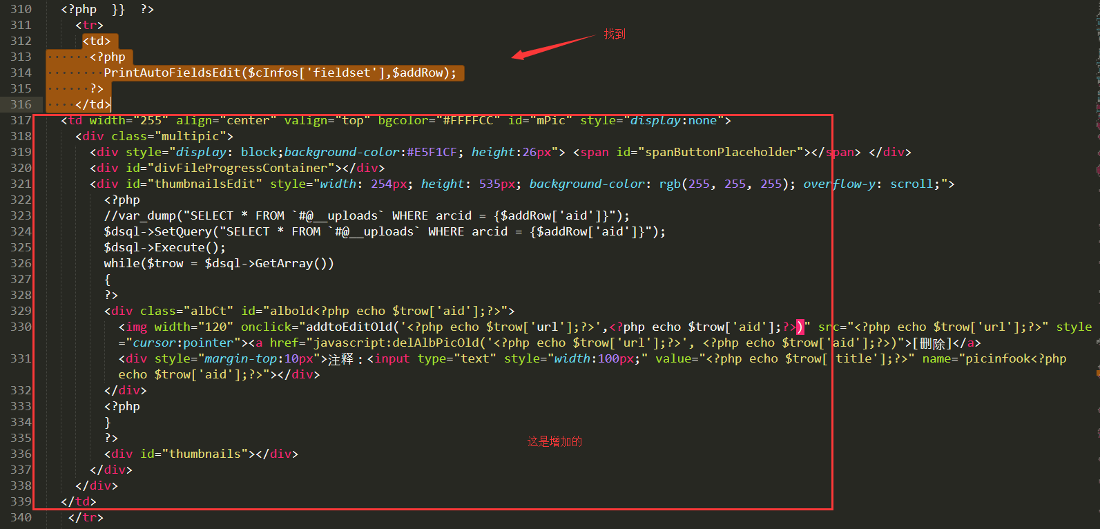 <td width="255" align="center" valign="top" bgcolor="#FFFFCC" id="mPic" style="display:none"><div class="multipic"><div style="display: block;background-color:#E5F1CF; height:26px"> <span id="spanButtonPlaceholder"></span> </div><div id="divFileProgressContainer"></div><div id="thumbnailsEdit" style="width: 254px; height: 535px; background-color: rgb(255, 255, 255); overflow-y: scroll;"><?php//var_dump("SELECT * FROM `dede_uploads` WHERE arcid = {$addRow['aid']}");$dsql->SetQuery("SELECT * FROM `dede_uploads` WHERE arcid = {$addRow['aid']}");$dsql->Execute();while($trow = $dsql->GetArray()){?><div class="albCt" id="albold<?php echo $trow['aid'];?>"><img width="120" onclick="addtoEditOld('<?php echo $trow['url'];?>',<?php echo $trow['aid'];?>)" src="<?php echo $trow['url'];?>" style="cursor:pointer"><a href="javascript:delAlbPicOld('<?php echo $trow['url'];?>', <?php echo $trow['aid'];?>)">[刪除]</a><div style="margin-top:10px">注釋:<input type="text" style="width:100px;" value="<?php echo $trow['title'];?>" name="picinfook<?php echo $trow['aid'];?>"></div></div><?php}?><div id="thumbnails"></div></div></div></td>