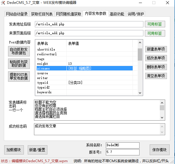 說明一下起因,因為有個網(wǎng)站的列表頁縮略圖我想采集成我網(wǎng)站的縮略圖。采集網(wǎng)址的是安裝標簽的形式已經(jīng)采集到了縮略圖并下載下來,發(fā)布的時候卻發(fā)現(xiàn)縮略圖是并沒有發(fā)布的~!為這個問題我困擾了很久,最近經(jīng)過不斷的嘗試,終于解決了,發(fā)現(xiàn)網(wǎng)絡上這個問題的答案很少,老鳥自然知道,可能沒分享出來,解決的辦法是把發(fā)布參數(shù):picname的值改成自己采集到的標簽,如圖: