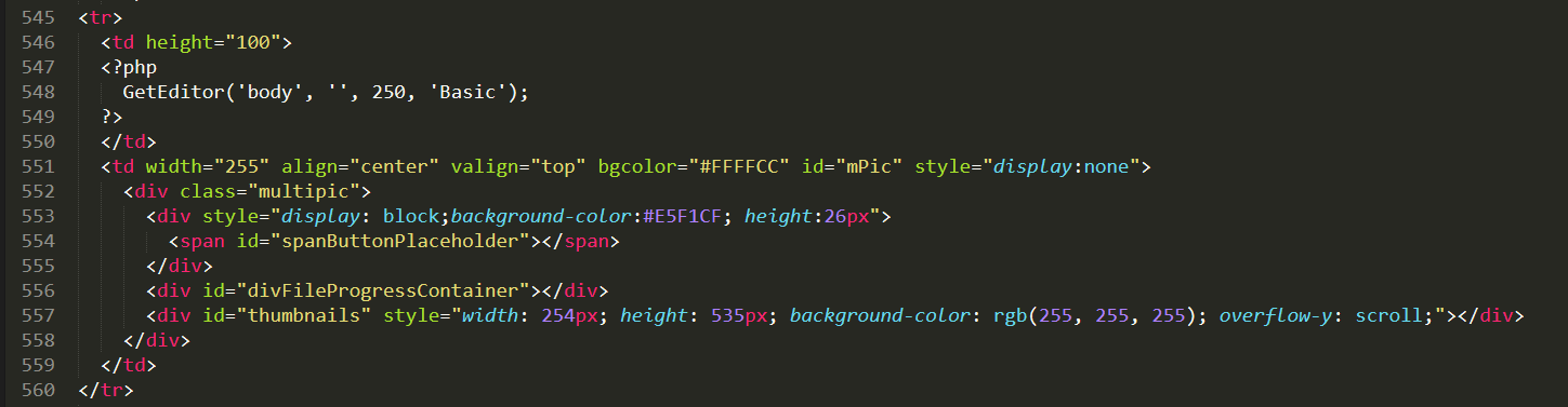 <tr><td height="100"><?phpGetEditor('body', '', 250, 'Basic');?></td><td width="255" align="center" valign="top" bgcolor="#FFFFCC" id="mPic" style="display:none"><div class="multipic"><div style="display: block;background-color:#E5F1CF; height:26px"><span id="spanButtonPlaceholder"></span></div><div id="divFileProgressContainer"></div><div id="thumbnails" style="width: 254px; height: 535px; background-color: rgb(255, 255, 255); overflow-y: scroll;"></div></div></td></tr>