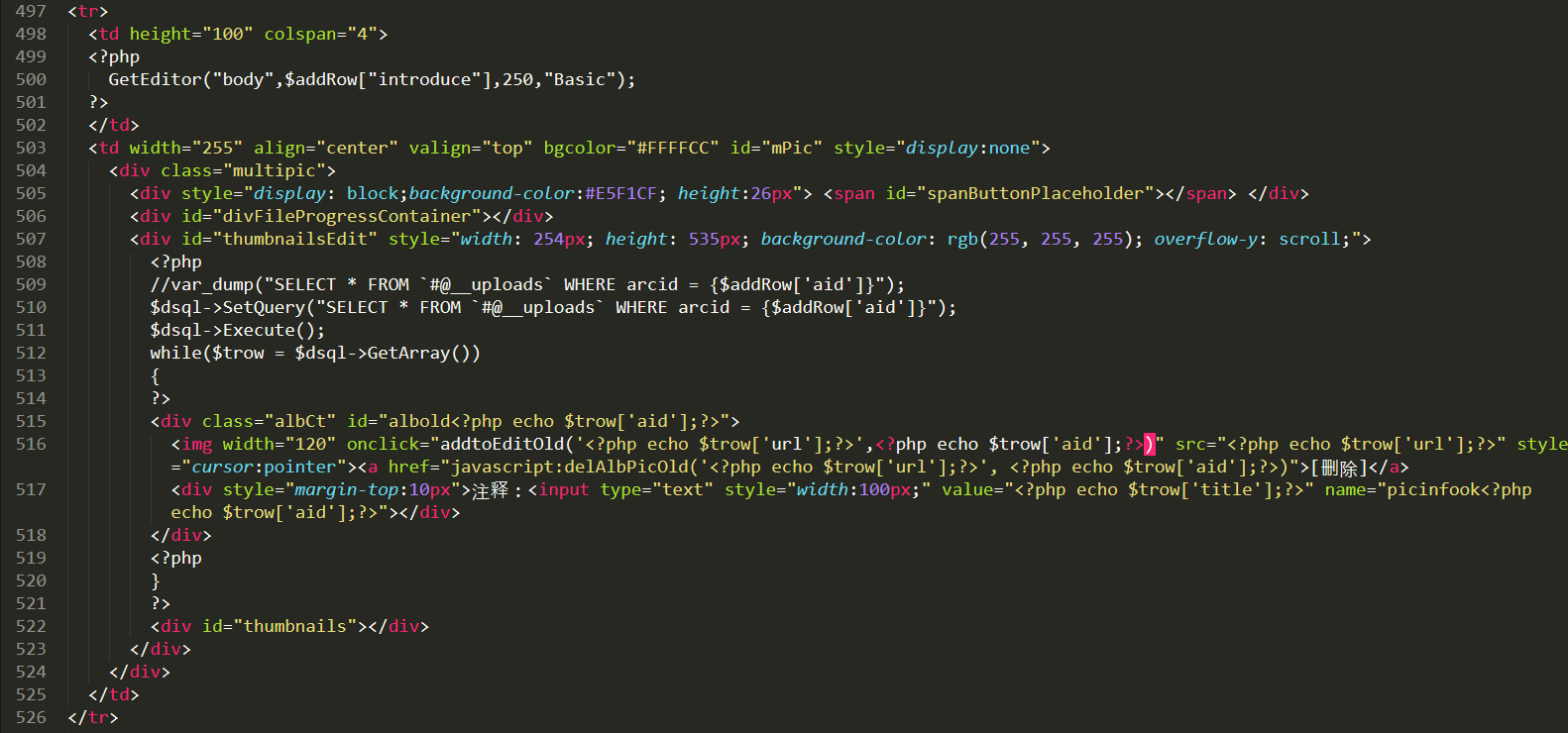<tr><td height="100" colspan="4"><?phpGetEditor("body",$addRow["introduce"],250,"Basic");?></td><td width="255" align="center" valign="top" bgcolor="#FFFFCC" id="mPic" style="display:none"><div class="multipic"><div style="display: block;background-color:#E5F1CF; height:26px"> <span id="spanButtonPlaceholder"></span> </div><div id="divFileProgressContainer"></div><div id="thumbnailsEdit" style="width: 254px; height: 535px; background-color: rgb(255, 255, 255); overflow-y: scroll;"><?php//var_dump("SELECT * FROM `dede_uploads` WHERE arcid = {$addRow['aid']}");$dsql->SetQuery("SELECT * FROM `dede_uploads` WHERE arcid = {$addRow['aid']}");$dsql->Execute();while($trow = $dsql->GetArray()){?><div class="albCt" id="albold<?php echo $trow['aid'];?>"><img width="120" onclick="addtoEditOld('<?php echo $trow['url'];?>',<?php echo $trow['aid'];?>)" src="<?php echo $trow['url'];?>" style="cursor:pointer"><a href="javascript:delAlbPicOld('<?php echo $trow['url'];?>', <?php echo $trow['aid'];?>)">[刪除]</a><div style="margin-top:10px">注釋:<input type="text" style="width:100px;" value="<?php echo $trow['title'];?>" name="picinfook<?php echo $trow['aid'];?>"></div></div><?php}?><div id="thumbnails"></div></div></div></td></tr>