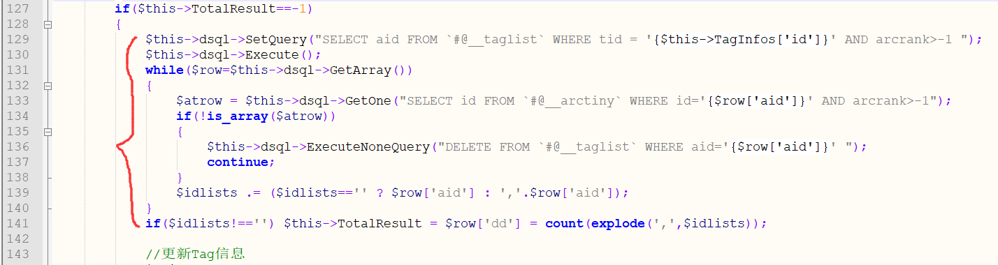 $this->dsql->SetQuery("SELECT aid FROM `dede_taglist` WHERE tid = '{$this->TagInfos['id']}' AND arcrank>-1 ");$this->dsql->Execute();while($row=$this->dsql->GetArray()){$atrow = $this->dsql->GetOne("SELECT id FROM `dede_arctiny` WHERE id='{$row['aid']}' AND arcrank>-1");if(!is_array($atrow)){$this->dsql->ExecuteNoneQuery("DELETE FROM `dede_taglist` WHERE aid='{$row['aid']}' ");continue;}$idlists .= ($idlists=='' ? $row['aid'] : ','.$row['aid']);}if($idlists!=='') $this->TotalResult = $row['dd'] = count(explode(',',$idlists));