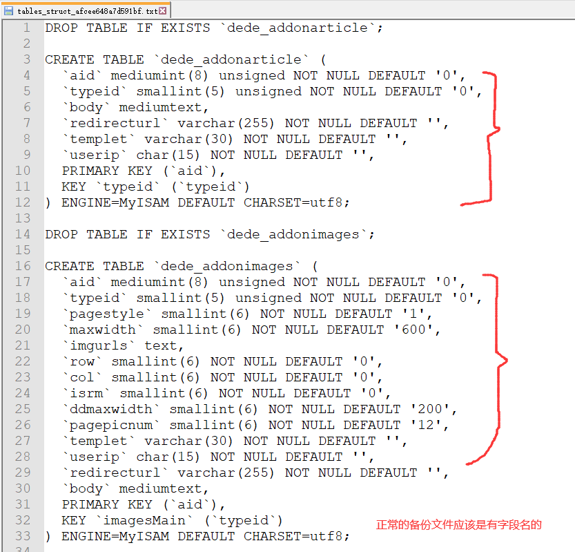 打開 /data/backupdata/tables_struct_xxxx.txt 開頭的備份文件查看,里面是沒有字段的