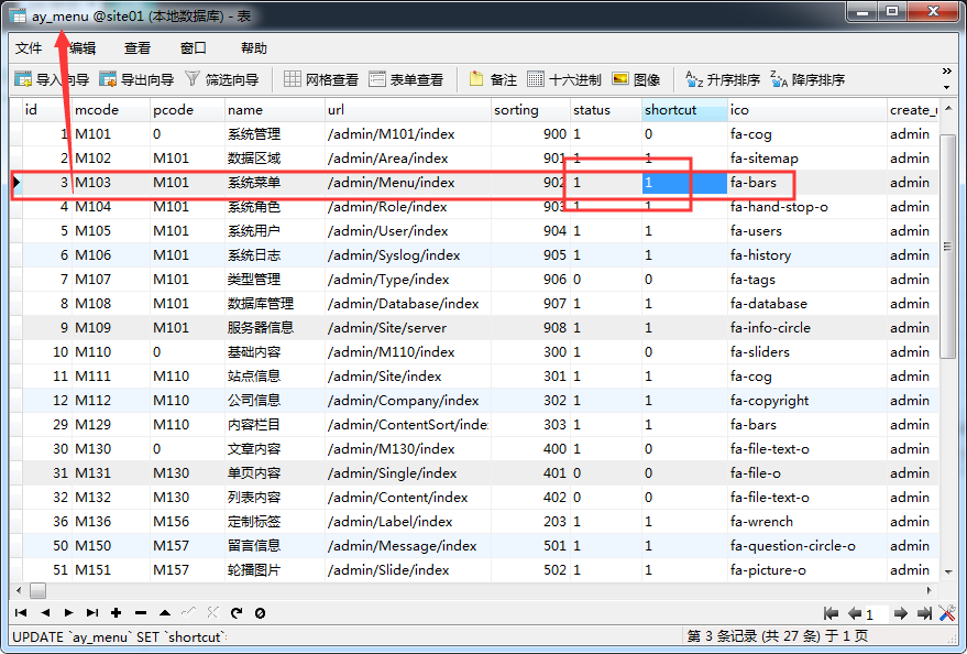 修改數(shù)據(jù)庫表ay_menu里的字段,如圖把雙紅色框位置數(shù)字改成1,默認(rèn)是0不顯示,修改后重新登錄后臺即可。
