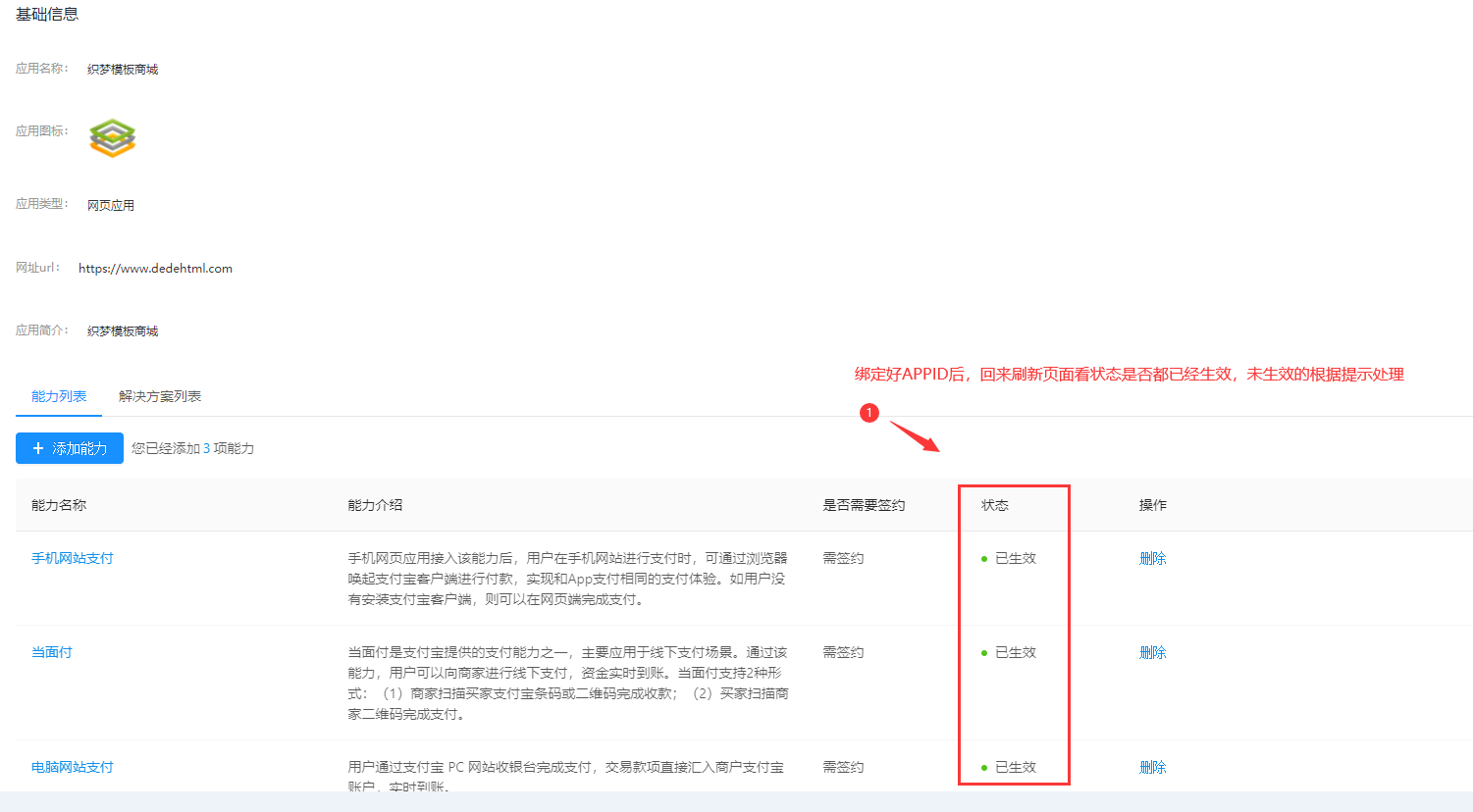 綁定成功后返回應(yīng)用詳情查看應(yīng)用能力是否生效