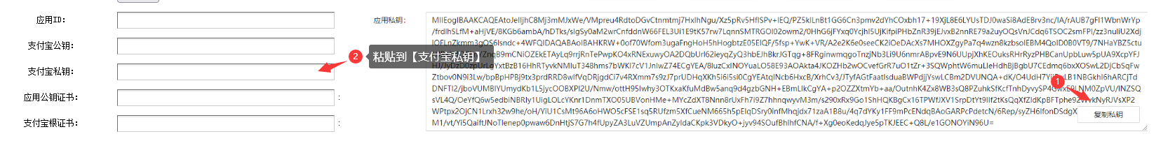 把生成的應(yīng)用私鑰復(fù)制,粘貼到后臺-系統(tǒng)-支付工具-支付寶,里面的【支付寶私鑰】輸入框里