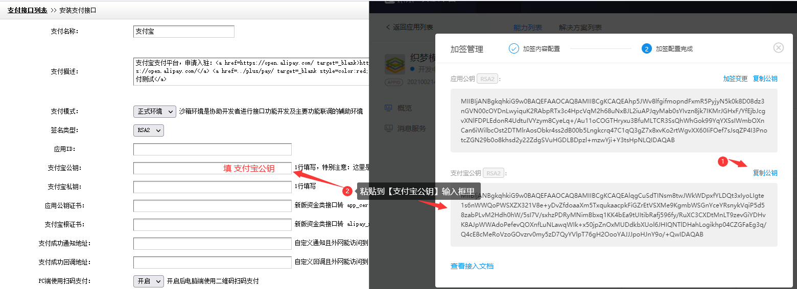 記得支付寶公鑰,并復(fù)制,粘貼到網(wǎng)站后臺支付寶配置的【支付寶公鑰】輸入框里