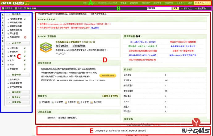C區(qū)域【主體左側(cè)】對應(yīng)文件:/dede/templets/index_menu2.htm【左側(cè)主鏈接】和/dede/inc/inc_menu.php【常用主鏈接下的次鏈接】、/dede/inc/inc_menu_map.php【主鏈接下的次鏈接】、/dede/inc/inc_menu_module.php【模塊和插件次導(dǎo)航】