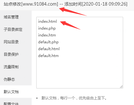 1、在主機(jī)里,修改默認(rèn)文檔順序?yàn)?index.html index.php index.htm 其中最重要的是 index.html 放第一位