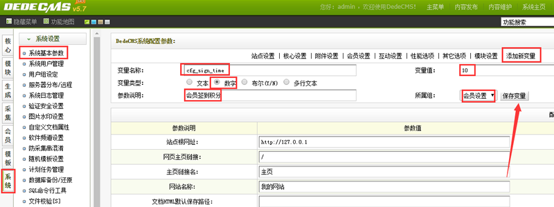 - 三、新增系統(tǒng)變量,用來(lái)設(shè)置簽到所得積分的數(shù)量