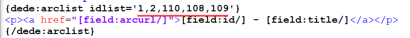 {dede:arclist idlist='1,2,110,108,109' orderby='idlist'}<p><a href="[field:arcurl/]">[field:id/] - [field:title/]</a></p>{/dede:arclist}