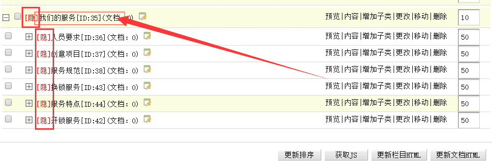 有4處,都刪除,保存,就可以調(diào)用隱藏欄目輸出了。