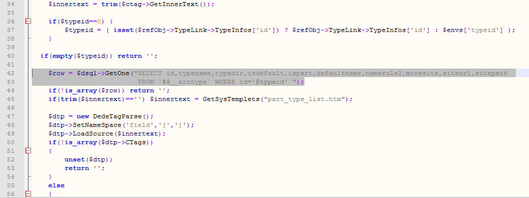 $row = $dsql->GetOne("SELECT id,typename,typedir,isdefault,ispart,defaultname,namerule2,moresite,siteurl,sitepathFROM `dede_arctype` WHERE id='$typeid' ");